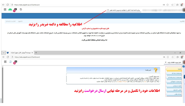 دانشجویان قبل آژمون باید فرم های اطلاعت پایه و ارزشیابی اساتید را تکمیل و همچنین نسبت به پرداخت بدهی خود اقدام نمایند تا هنگام امتحان مشکلی برای دانشجویان عزیز پیش نیاید.