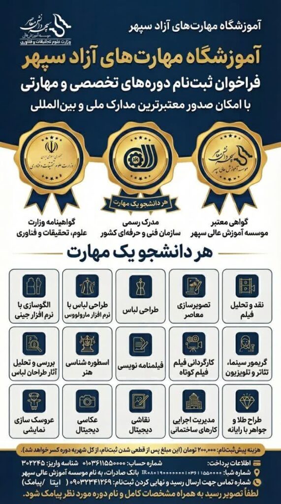 آینده شغلی خود را همین امروز بسازید! آموزشگاه مهارتهای آزاد سپهر (وابسته به موسسه آموزش عالی سپهر) با افتخار برگزار میکند.